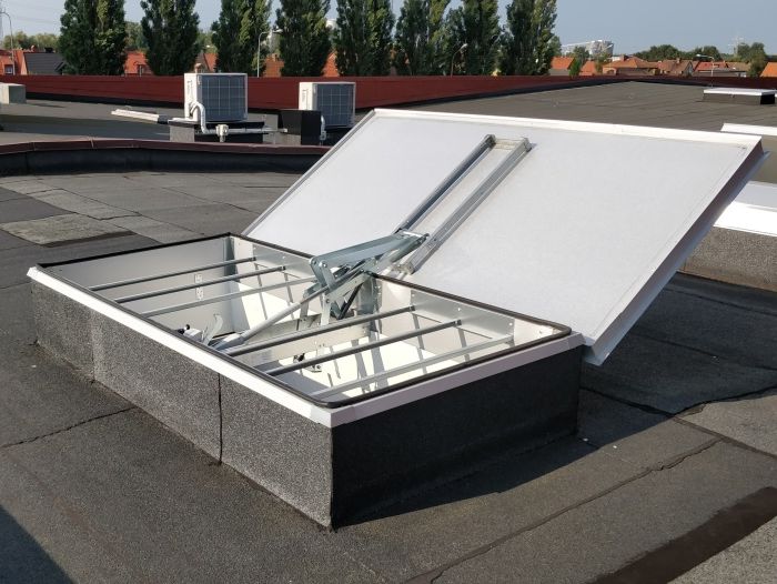 Uppåtgående brandgasventilator med ett plåtlock. En rökgaslucka med gasfjädermekanism för både nybyggnation och renovering.