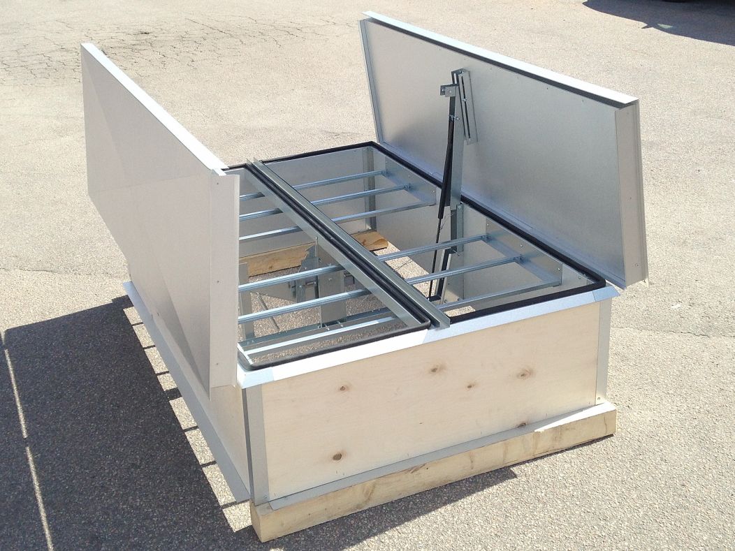 Detta är en brandgasventilator med ett eller två isolerade lock som är utvändigt och invändigt klätt med aluzinkplåt. Brandgasventilatorn levereras med 72 graders smältsäkring och gastryckfjädrar för öppning, men kan även förses med 24V. hållmagnet eller en elmotor som, förutom att öppna vid brandgasventilation, även kan användas för komfortventilation.
